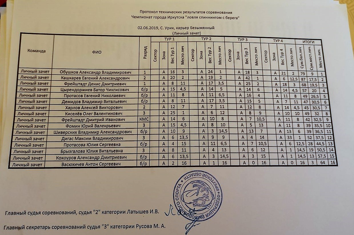 Федерация рыболовного спорта Иркутской области подвела итоги прошедшего 2 июня 2019 года открытого чемпионата города Иркутска по рыболовному спорту в дисциплине «ловля спиннингом с берега» (0920051811Л). В мероприятии участвовало 16 сильнейших спортсменов из города Иркутска, Ангарска и других населенных пунктов Иркутской области.